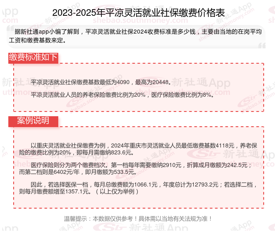 据新社通app显示,平凉灵活就业人员养老保险缴费基数2024-2025年最新标准如下: