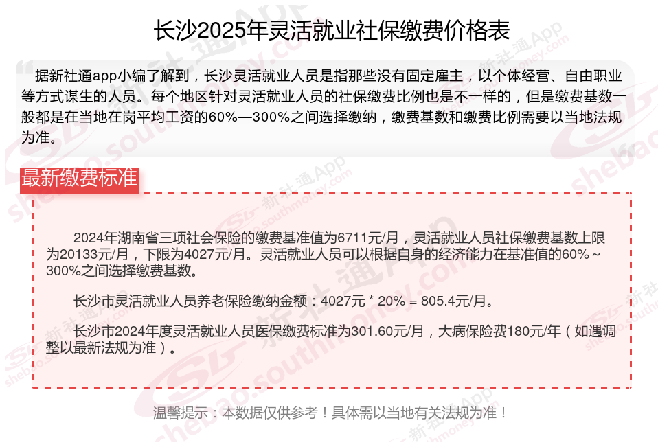 据新社通app数据显示,长沙灵活就业养老保险缴费基数2024-2025年最新标准如下: