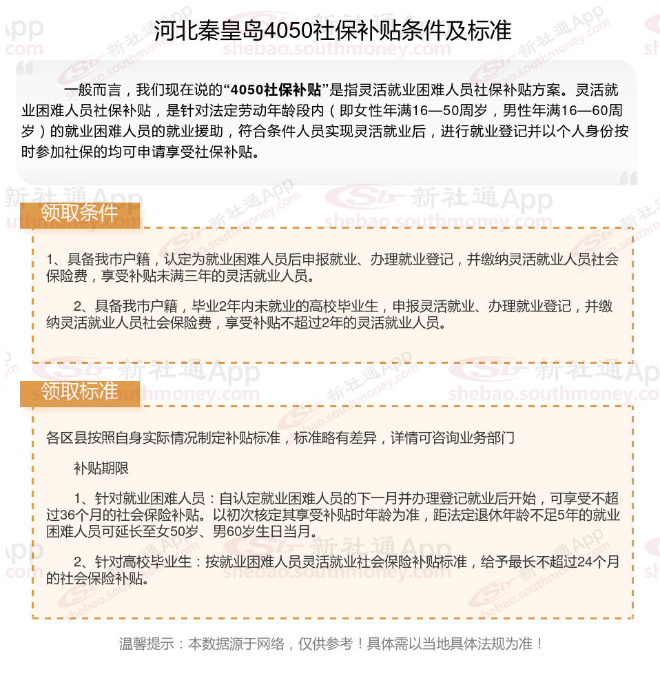 2025河北秦皇岛灵活就业4050社保补贴是一项面向特定年龄段的就业困难人群的社会保险补贴。