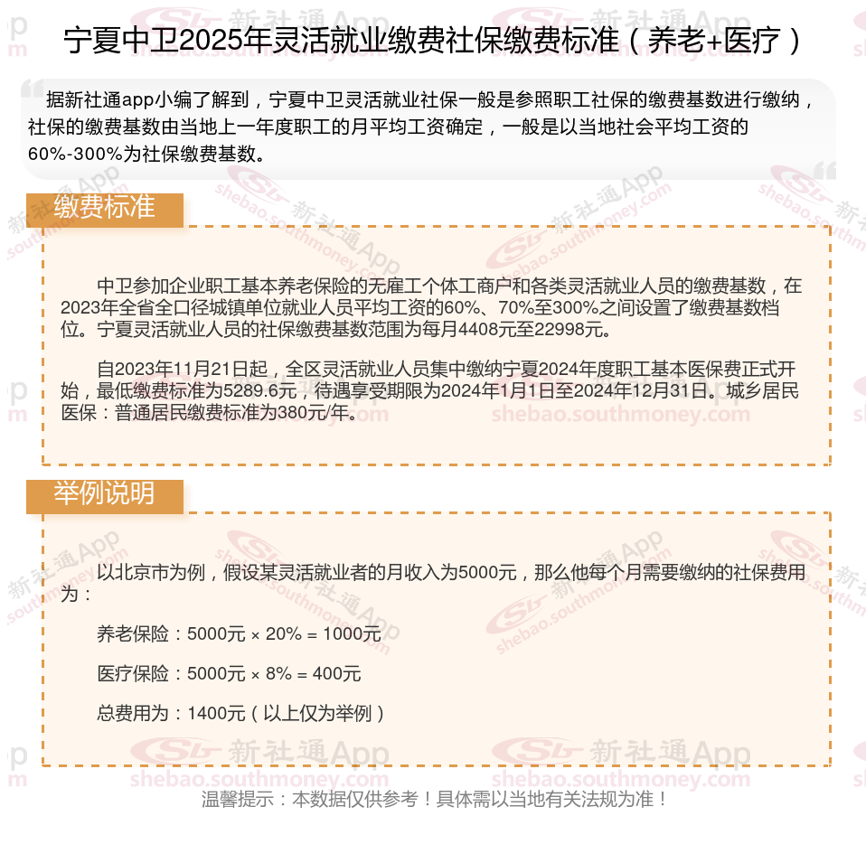 据新社通app数据显示,宁夏中卫灵活就业养老保险缴费基数2024-2025年最新标准如下: