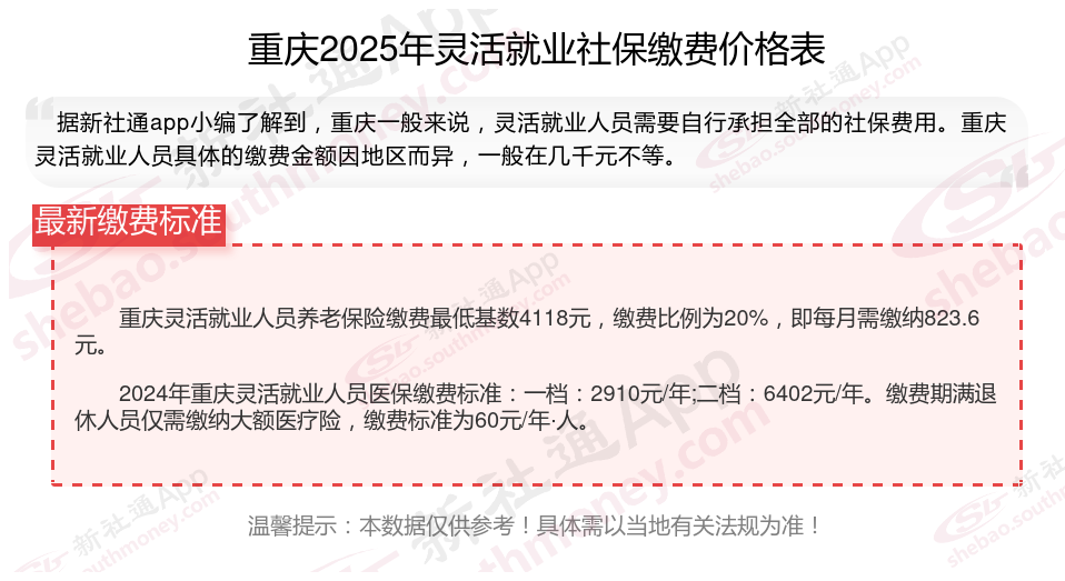 重庆灵活就业社保2025年收费标准是多少钱,主要由当地的在岗平均工资和缴费基数来定。其次,灵活就业社保缴纳跟职工缴纳不同的地方在于,灵活就业社保参保只能参保养老保险和医疗保险,且缴纳比例完全由个人承担。另外,灵活就业人员社保参保选择,可自由选择参保城镇职工社保和城乡居民保险。2025年重庆灵活就业社保缴多少钱?如何缴纳?怎么计算待遇?新社通APP小编将在下文为您详细说明。