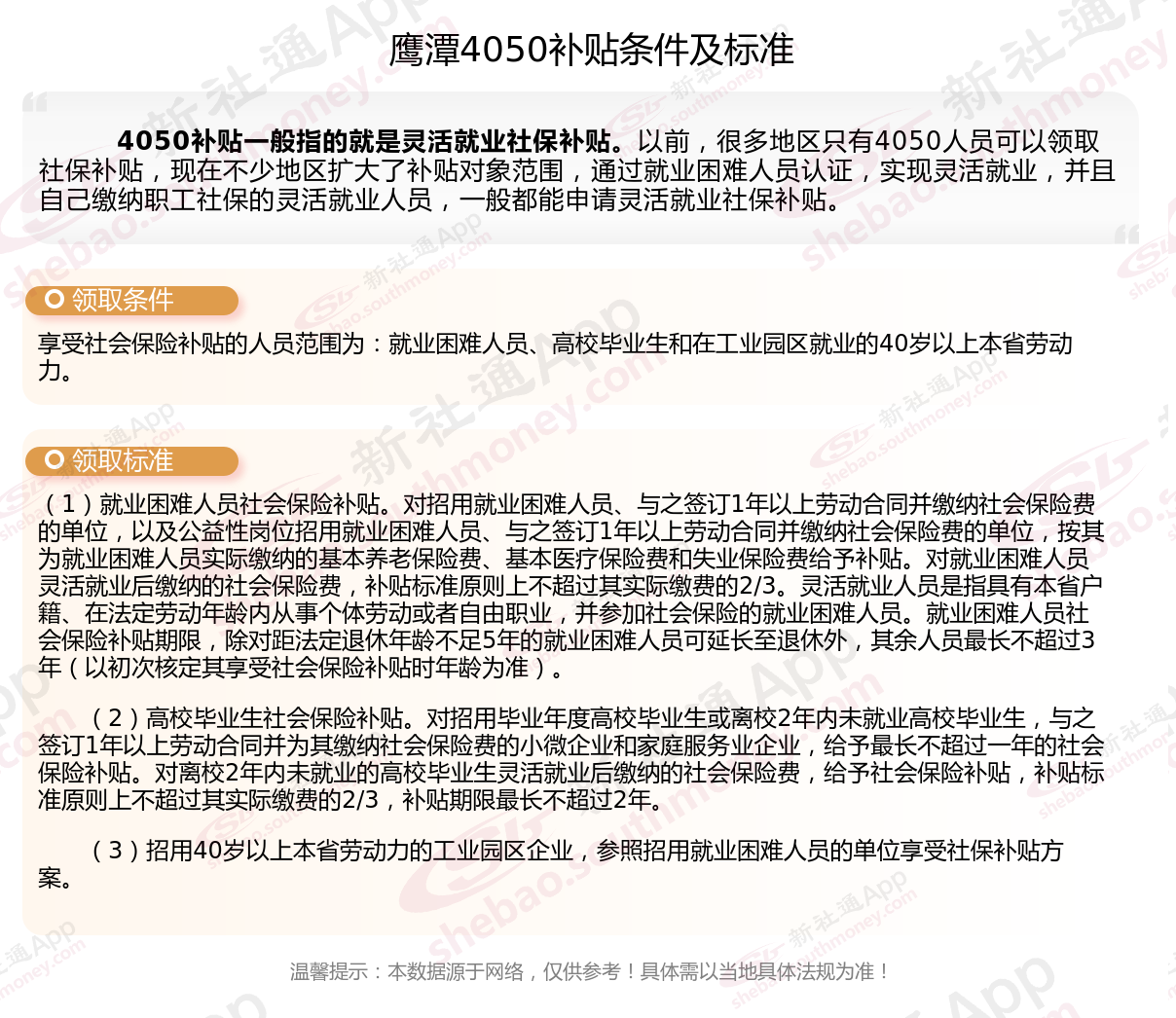 二、鹰潭4050社保补贴标准及条件2025年最新消息