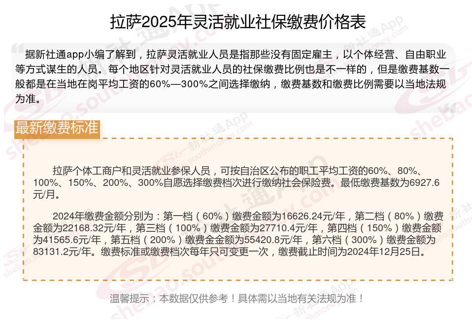灵活就业社保缴费价格表来了!2024-2025年拉萨灵活就业人员社保需要缴费多少钱一个月?根据新社通app-社保缴费查询工具提供的最新数据如下: