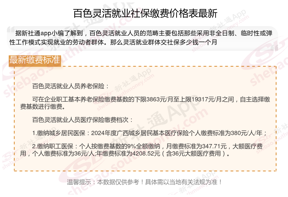 一、2025年百色灵活就业社保缴费标准表 百色灵活就业社保多少钱一个月?