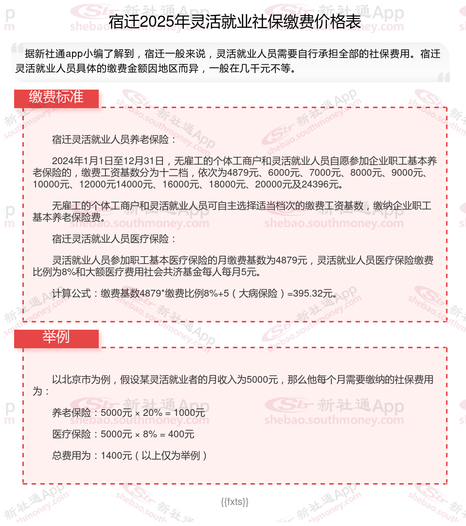 2025年宿迁灵活就业人员社保需要交多少钱?灵活就业,作为一种非传统的就业方式,近年来蓬勃发展。为保护这部分人群的权益,国制定了相应的社保缴费法规。2024年,灵活就业社保缴费法规继续完善,涵盖了养老保险、医疗保险、失业保险等多个方面,旨在为灵活就业人员提供全面的社会保证。接下来随新社通APP小编一起来看看。