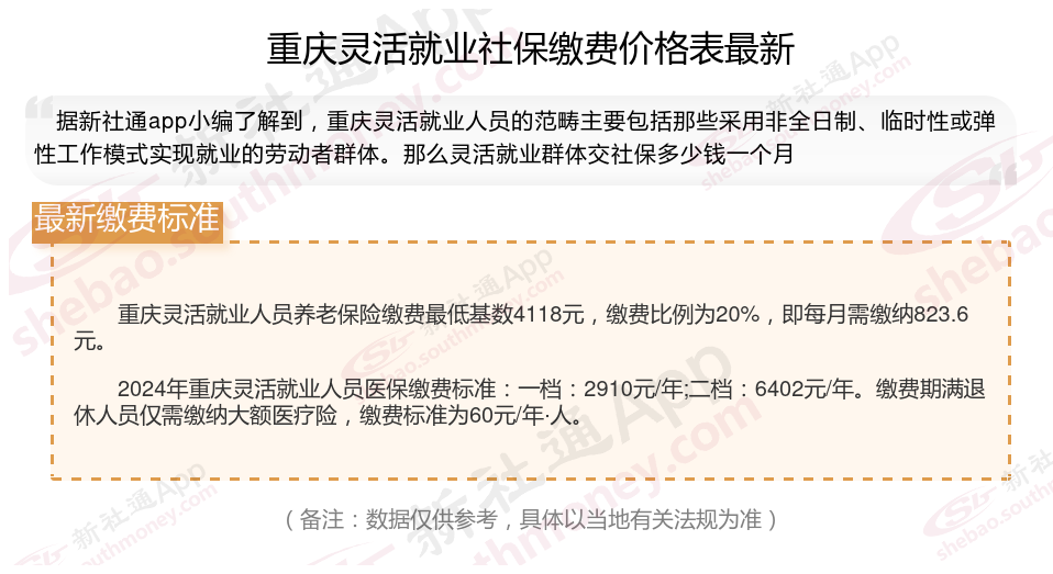 灵活就业社保是指针对灵活就业人员的社会保险制。灵活就业人员包括个体经营者、自由职业者、临时工等,他们没有固定的雇主,因此需要自行缴纳社会保险。那么2025年重庆灵活就业人员社保需要交多少钱?下面随新社通小编一起来看看。