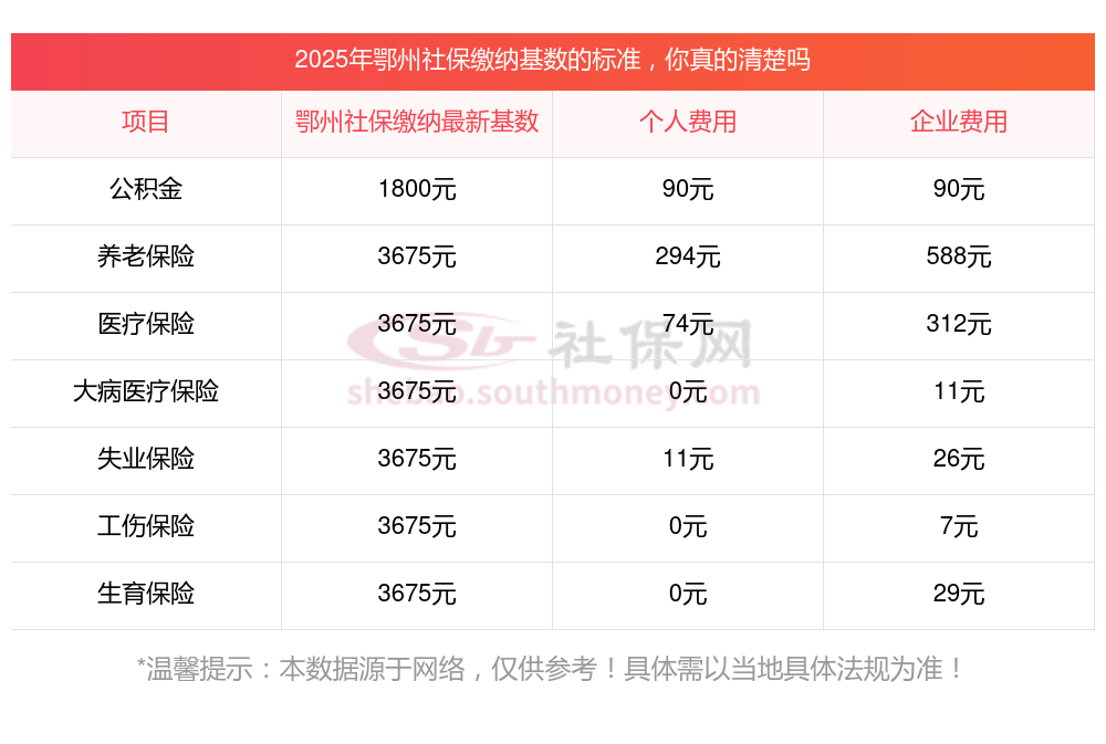 鄂州职工社保缴费多少钱?2025年鄂州职工社保缴费基数最新参考为:3579.00,具体如下: