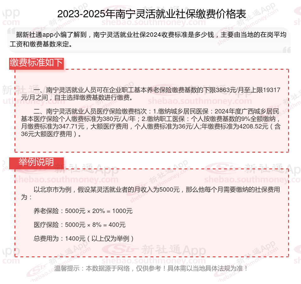 2025年南宁灵活就业人员社保需要交多少钱?灵活就业,作为一种非传统的就业方式,近年来蓬勃发展。为保护这部分人群的权益,国制定了相应的社保缴费法规。2024年,灵活就业社保缴费法规继续完善,涵盖了养老保险、医疗保险、失业保险等多个方面,旨在为灵活就业人员提供全面的社会保证。接下来随新社通APP小编一起来看看。