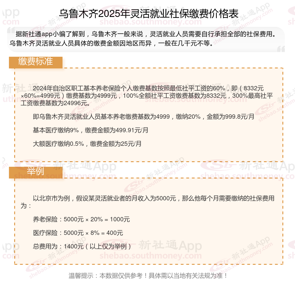 灵活就业社保是指针对灵活就业人员的社会保险制。灵活就业人员包括个体经营者、自由职业者、临时工等,他们没有固定的雇主,因此需要自行缴纳社会保险。接下来随社保君了解一下2025年乌鲁木齐灵活就业人员社保交多少钱,2025年乌鲁木齐灵活就业社保缴费标准的详细内容。