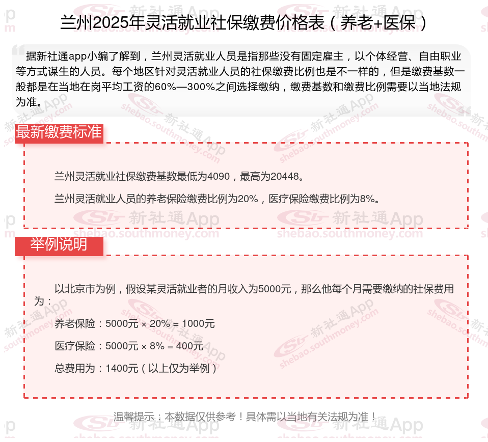 2025年兰州灵活就业人员社保需要交多少钱?灵活就业社保缴费比例是多少?养老保险一般为缴费基数的20%左右,其中8%计入个人账户,12%计入统筹账户。医疗保险一般为缴费基数的10%左右,具体比例因地区而异。失业保险、工伤保险、生育保险缴费比例较低,具体比例因地区而异。接下来随新社通APP小编一起来看看兰州灵活就业人员社保缴费的内容。