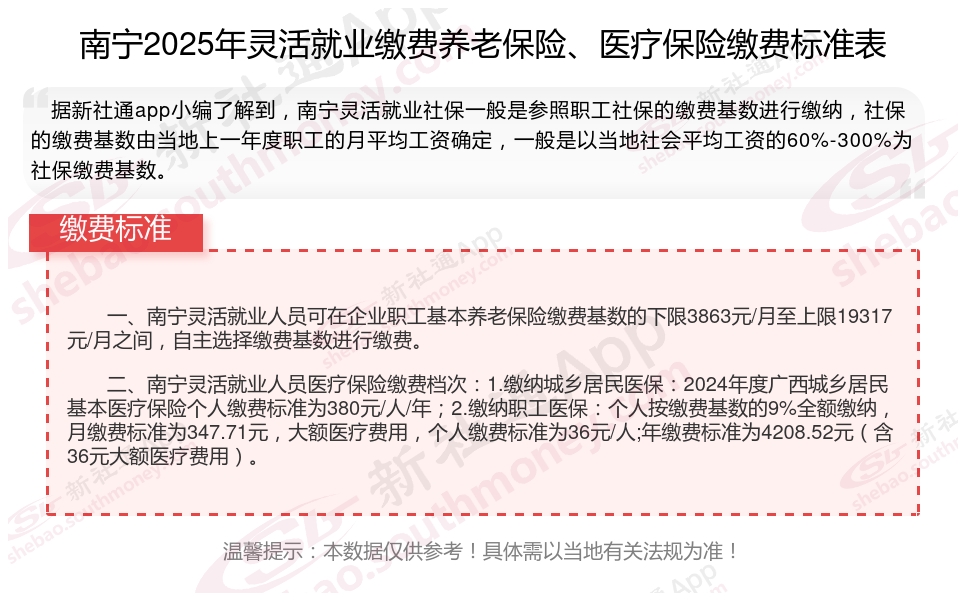 灵活就业社保缴费标准每年都会有所调整,主要体现在缴费基数和缴费比例上。接下来随社保君了解一下2025年南宁灵活就业人员社保缴费标准是怎样的的相关内容。