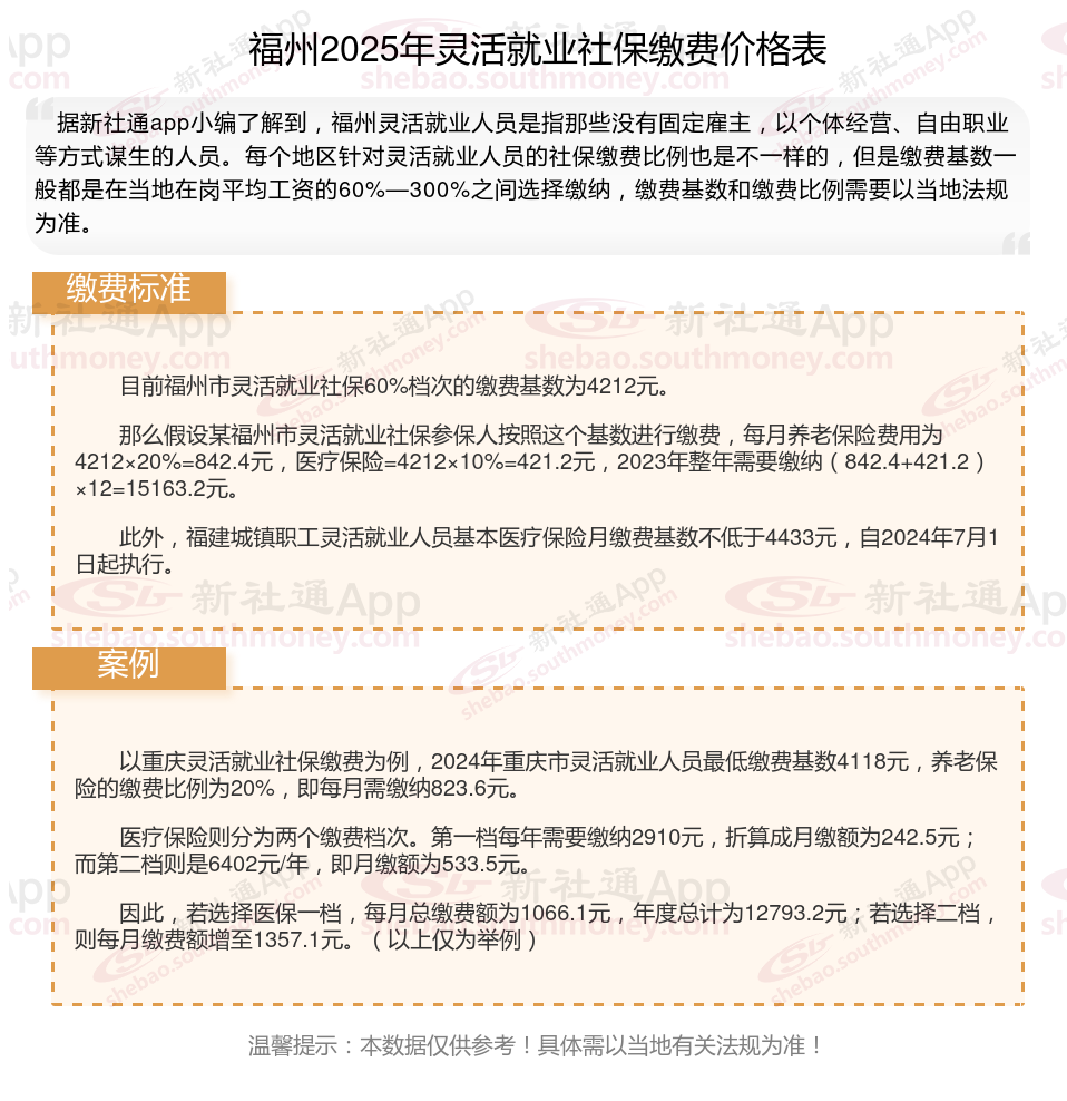 2025年福州灵活就业人员社保需要交多少钱?灵活就业,作为一种非传统的就业方式,近年来蓬勃发展。为保护这部分人群的权益,国制定了相应的社保缴费法规。2024年,灵活就业社保缴费法规继续完善,涵盖了养老保险、医疗保险、失业保险等多个方面,旨在为灵活就业人员提供全面的社会保证。接下来随新社通APP小编一起来看看。