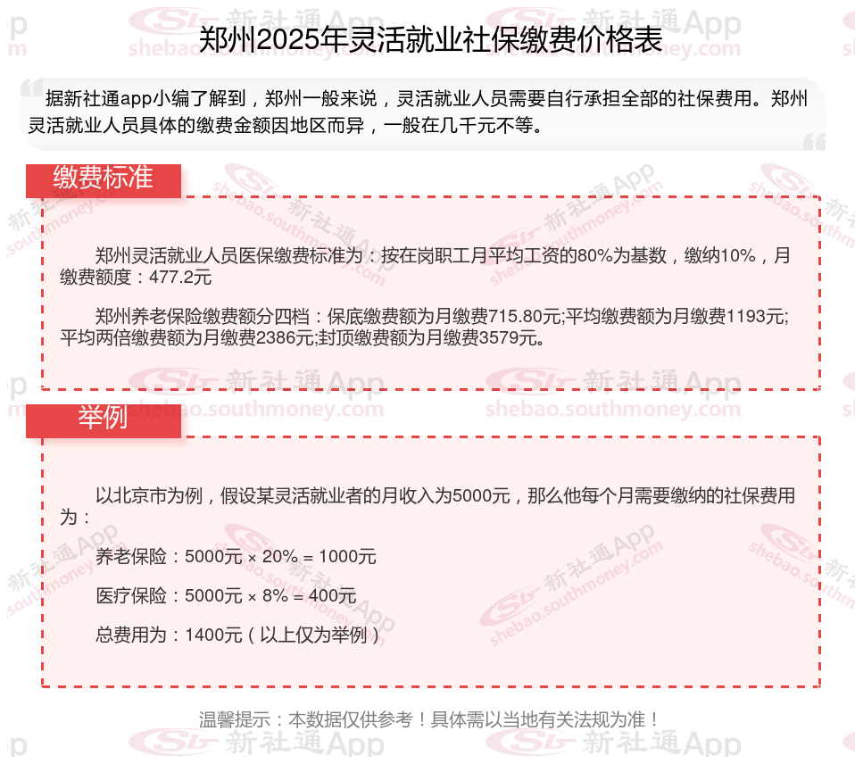 灵活就业社保通常只需缴纳养老和医疗两项(部分地区可自愿选缴失业险),其他险种无需强制缴纳。灵活就业社保缴费满15年后,退休后可领取养老金,避免老年无收入来源。接下来随社保君了解一下2025年郑州灵活就业人员社保交多少钱,2025年郑州灵活就业社保缴费标准的详细内容。