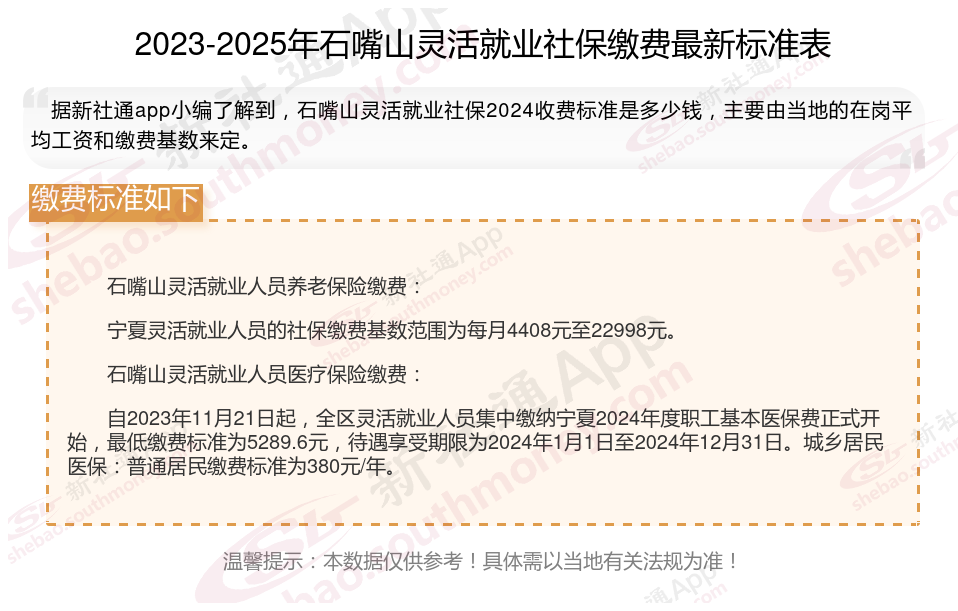 2025年石嘴山灵活就业人员社保需要交多少钱?社保能抵御疾病、失业、养老等重大风险,避免陷入经济困境。也能享受医保报销、养老金增长等红利。社保是劳动者的法定权利,断缴可能影响购房、落户、子女教育等。接下来随新社通APP小编一起来看看石嘴山灵活就业人员社保缴费的内容。