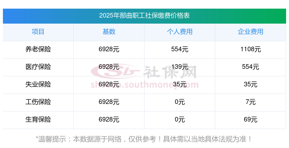 2025年那曲社保多少钱一个月?那曲社保缴费基数、比例一览表那曲在职人员缴纳的社保费用,一般都是交纳五险,按照最低缴费档次进行交费,一年大概需要交几千元至一万多元,如果按照最高缴费档次进行交费,一年大概要交几万元。