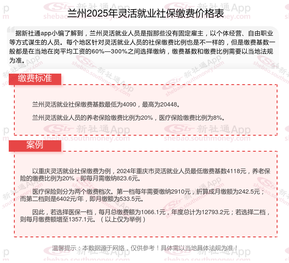 什么是灵活就业社保?简单讲灵活就业人员购买的社保就叫灵活就业社保。灵活就业人员是指以非全日制、临时性和弹性工作等灵活形式就业的人员。那么2025年兰州灵活就业社保缴费基数是多少?要怎么缴费?接下来随新社通APP小编一起了解兰州灵活就业社保缴费具体详情吧。