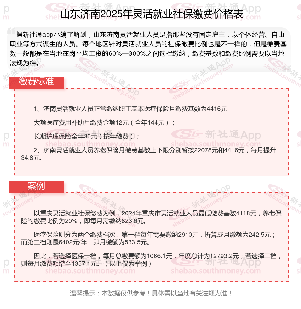 灵活就业社保通常只需缴纳养老和医疗两项(部分地区可自愿选缴失业险),其他险种无需强制缴纳。灵活就业社保缴费满15年后,退休后可领取养老金,避免老年无收入来源。接下来随社保君了解一下2025年山东济南灵活就业人员社保交多少钱,2025年山东济南灵活就业社保缴费标准的详细内容。