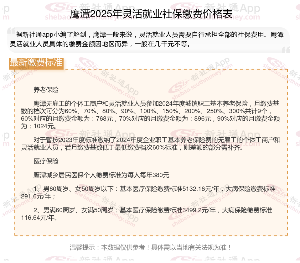 鹰潭灵活就业社保2025年收费标准是多少钱,主要由当地的在岗平均工资和缴费基数来定。其次,灵活就业社保缴纳跟职工缴纳不同的地方在于,灵活就业社保参保只能参保养老保险和医疗保险,且缴纳比例完全由个人承担。另外,灵活就业人员社保参保选择,可自由选择参保城镇职工社保和城乡居民保险。2025年鹰潭灵活就业社保缴多少钱?如何缴纳?怎么计算待遇?新社通APP小编将在下文为您详细说明。