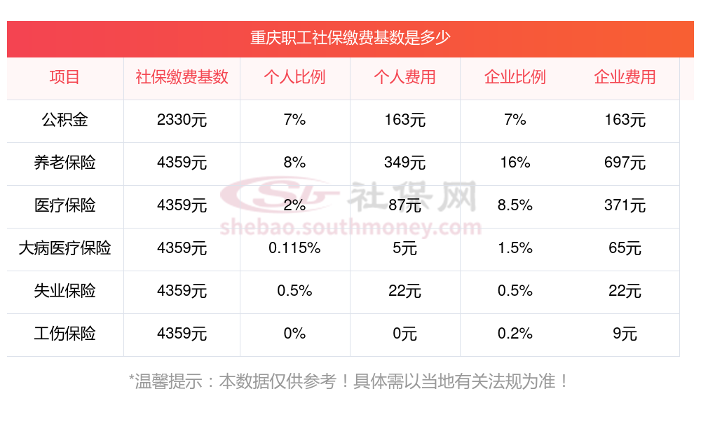 重庆职工社保缴费多少钱?重庆职工社保缴费基数最新参考为:3579.00,具体如下: