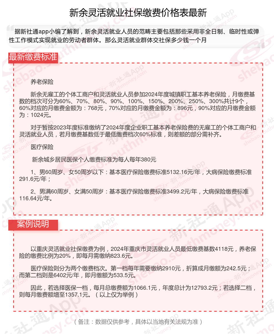 一、2024年新余灵活就业社保多少钱一个月?新余灵活就业社保缴费标准表如下: