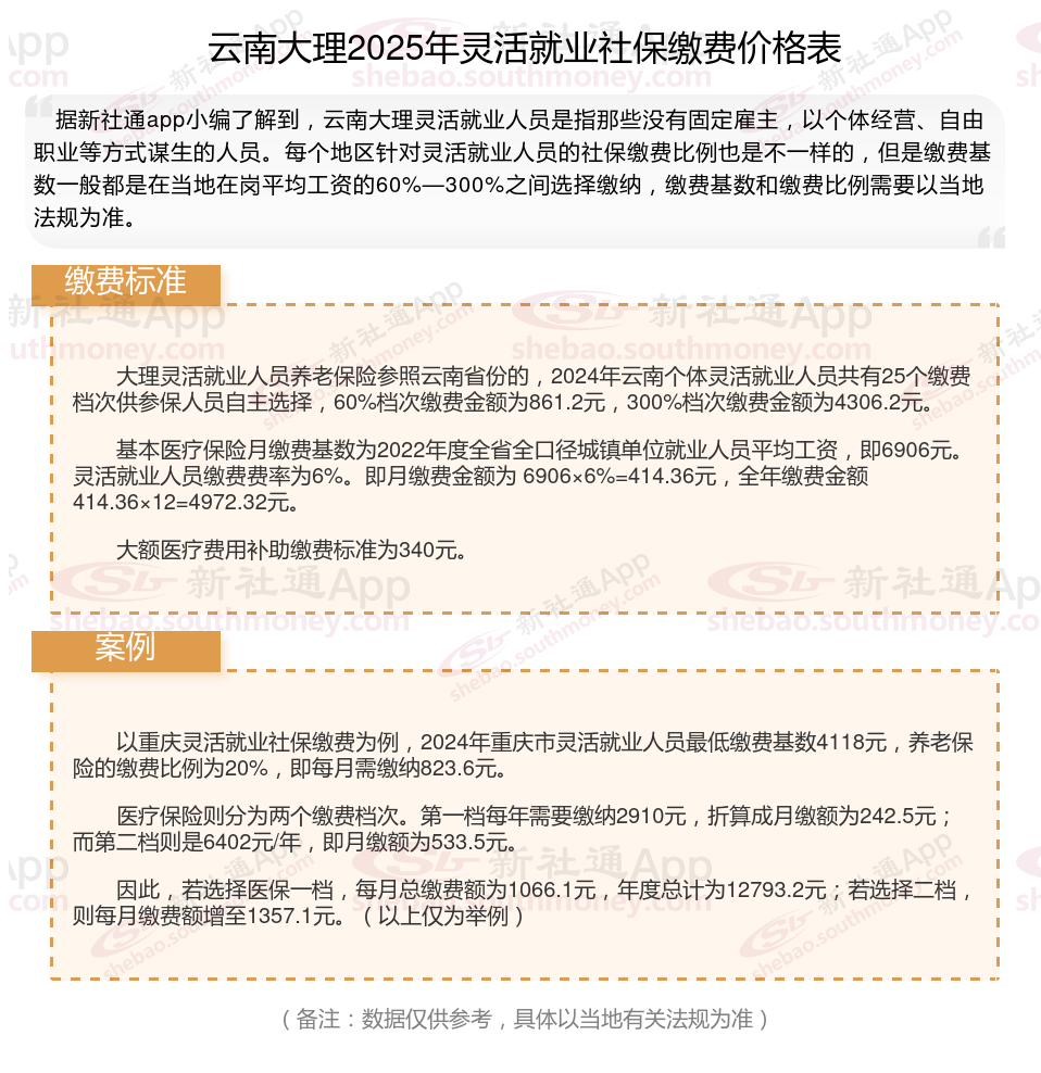 2025年云南大理灵活就业人员社保需要交多少钱?灵活就业,作为一种非传统的就业方式,近年来蓬勃发展。为保护这部分人群的权益,国制定了相应的社保缴费法规。2024年,灵活就业社保缴费法规继续完善,涵盖了养老保险、医疗保险、失业保险等多个方面,旨在为灵活就业人员提供全面的社会保证。接下来随新社通APP小编一起来看看。