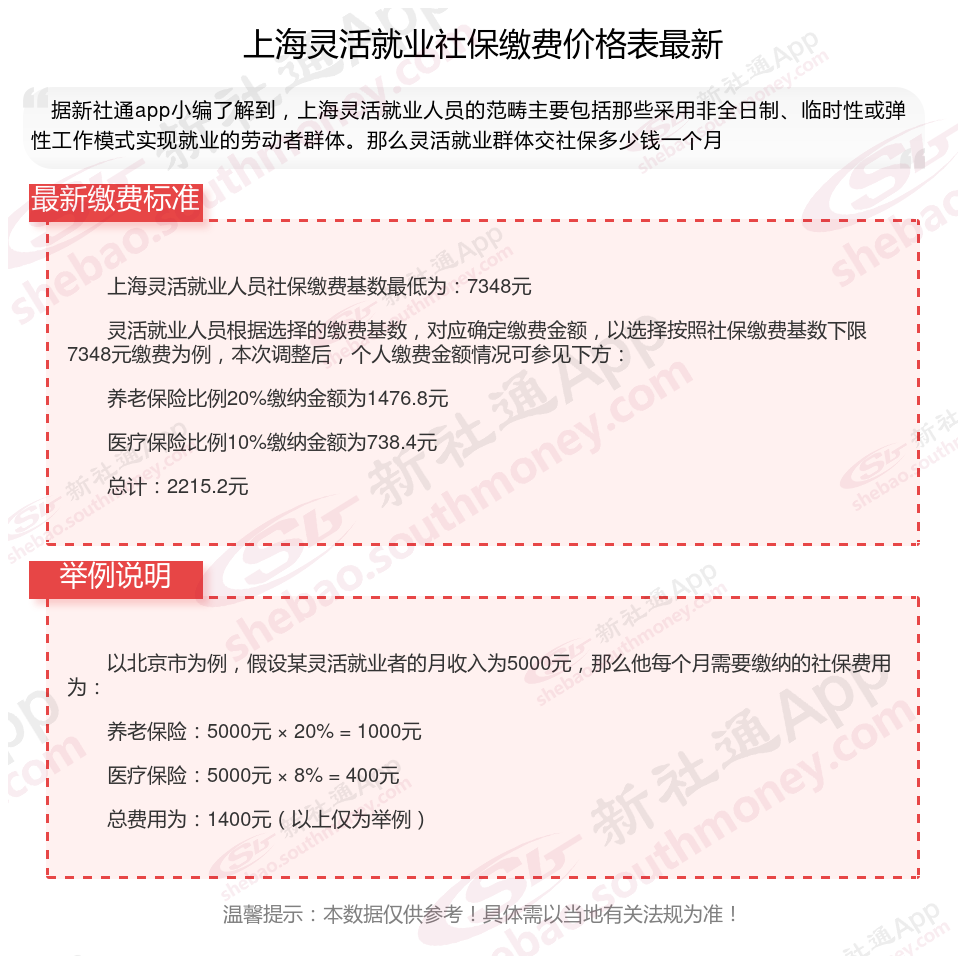 上海灵活就业社保2025年收费标准是多少钱,主要由当地的在岗平均工资和缴费基数来定。其次,灵活就业社保缴纳跟职工缴纳不同的地方在于,灵活就业社保参保只能参保养老保险和医疗保险,且缴纳比例完全由个人承担。另外,灵活就业人员社保参保选择,可自由选择参保城镇职工社保和城乡居民保险。2025年上海灵活就业社保缴多少钱?如何缴纳?怎么计算待遇?新社通APP小编将在下文为您详细说明。
