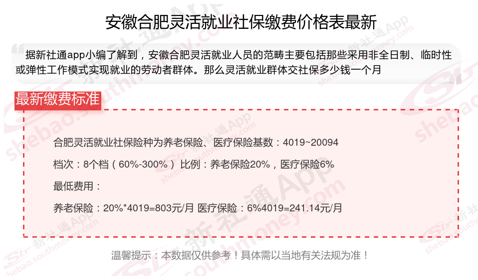 一、2024年安徽合肥灵活就业社保缴费标准表 安徽合肥灵活就业社保多少钱一个月?