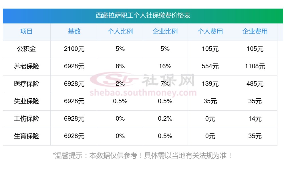一、西藏拉萨职工社保缴费基数是多少钱一个月?职工社保缴纳标准最新如下: