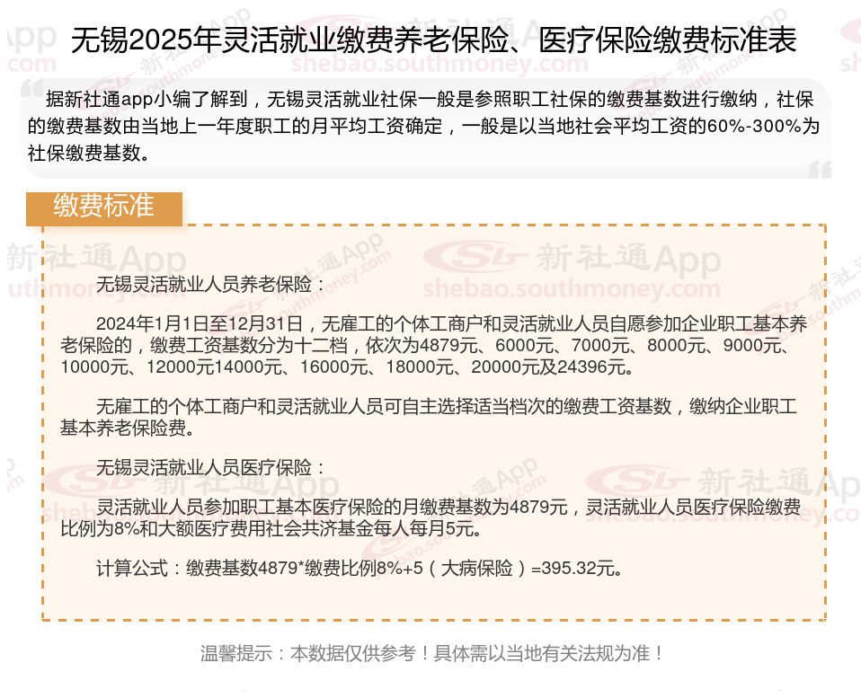 随着经济社会的不断发展,灵活就业群体日益壮大,其社保缴费问题也愈发受到关注。那么2025年无锡灵活就业人员社保需要交多少钱,缴费比例是多少?下面随新社通小编一起来看看。