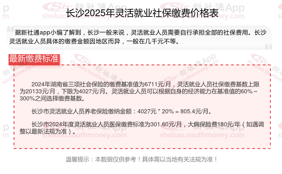 2025年长沙灵活就业人员社保交多少钱,你了解2025年长沙灵活就业人员社保缴费基数及比例吗,据新社通小编了解到,灵活就业社保缴费标准每年都会有所调整,主要体现在缴费基数和缴费比例上。接下来随新社通APP小编一起来看看。