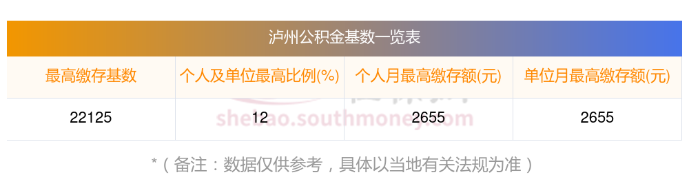 依据泸州有关部门关于2022年全市城镇全部单位就业人员平均工资的通告中公布的我市城镇非私营单位就业人员平均工资数据,我市住房公积金缴存基数上限标准调整为22125元。