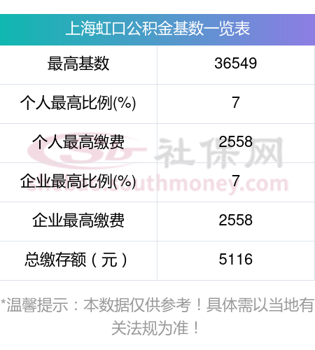 上海虹口住房公积金的基数上限、下限、比例如下: