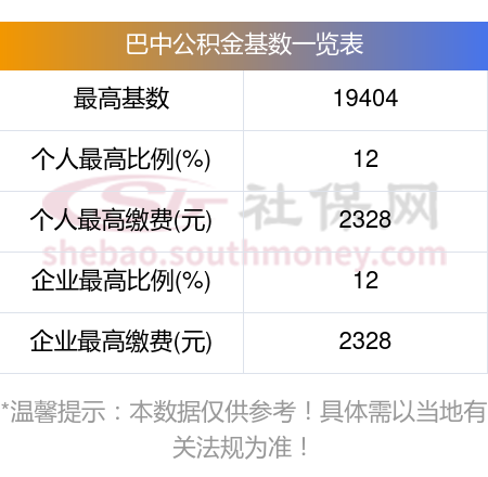 按照巴中市相关部门公布的2022年巴中市城镇非私营单位就业人员年平均工资计算,本年度缴存基数上限为19404元;根据四川有关部门关于调整我省最低工资标准的法定,本年度缴存基数下限为1970元。