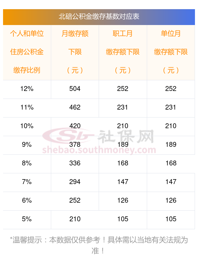 通过北京已经公布的公积金基数计算出不同的缴存比例每月要缴费的费用表: