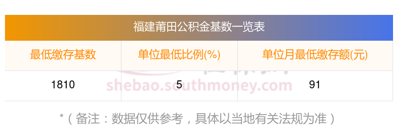 福建莆田住房公积金月缴存额下限是多少?住房公积金缴存比例及基数范围如下: