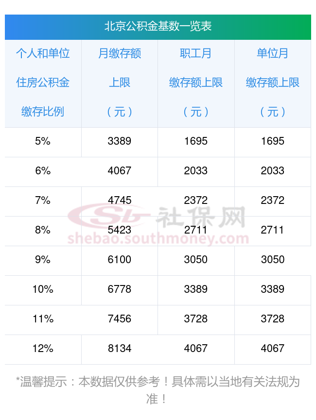 2023年北京公积金缴存基数上限下限对照表,上限比例对比缴存基数表: