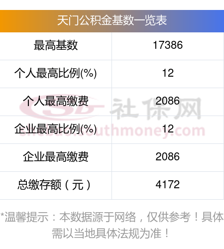天门住房公积金的基数上限、下限、比例如下: