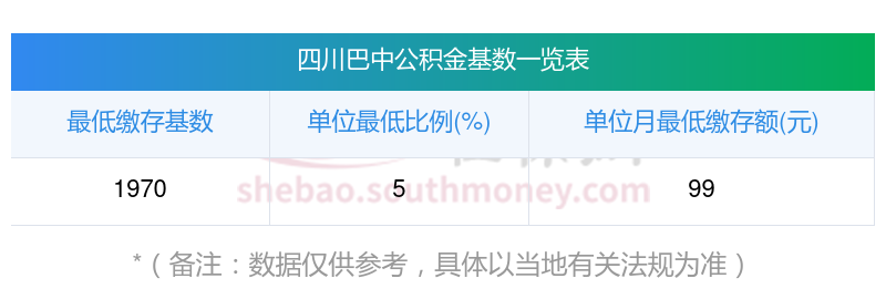 四川巴中住房公积金月缴存额下限是多少?住房公积金缴存比例及基数范围如下: