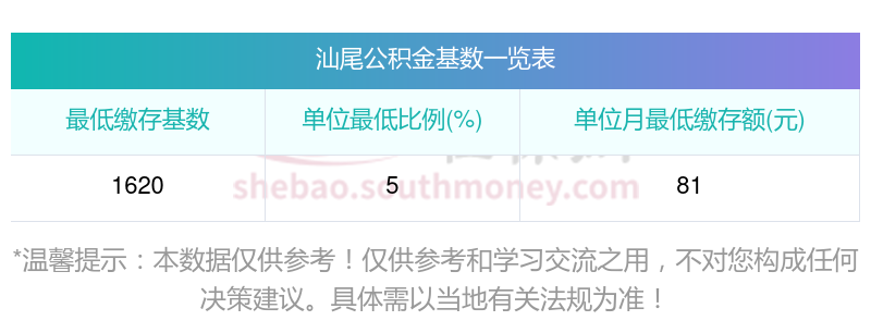 汕尾住房公积金月缴存额下限是多少?住房公积金缴存比例及基数范围如下: