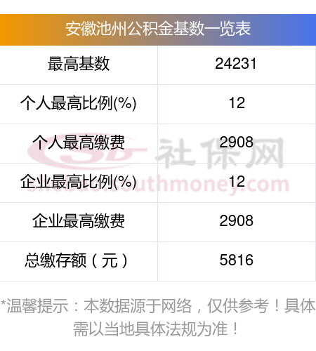 2024年安徽池州公积金基数上限:24231