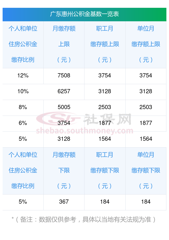 公积金缴存比例是怎么定的?全国统一法定的吗?缴存比例也叫应缴公积金的系数的,缴存比例,一般指住房公积金的缴存比例,就是你应缴公积金的系数,它和本人月平均基数和应缴系数都有关系,平均工资额和系数的增加或减少,应缴公积金的数额都会相应变化。下面跟随社保网小编来了解:惠州的最新公积金缴存比例及可以选择的比例多少种。