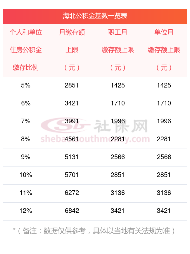 每月缴纳的住房公积金你了解多少?2025年海北住房公积金年度住房公积金缴存基数上限为35283元。如按照12%的缴存比例,最高每月可缴存8468元,对于不同的缴存比例对于的缴纳金额是不一样的。