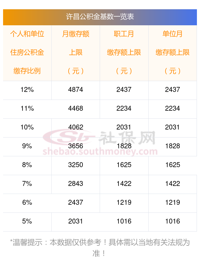 最新许昌的住房公积金缴存基数范围是2420~35283,上限比例范围是5%-12%。