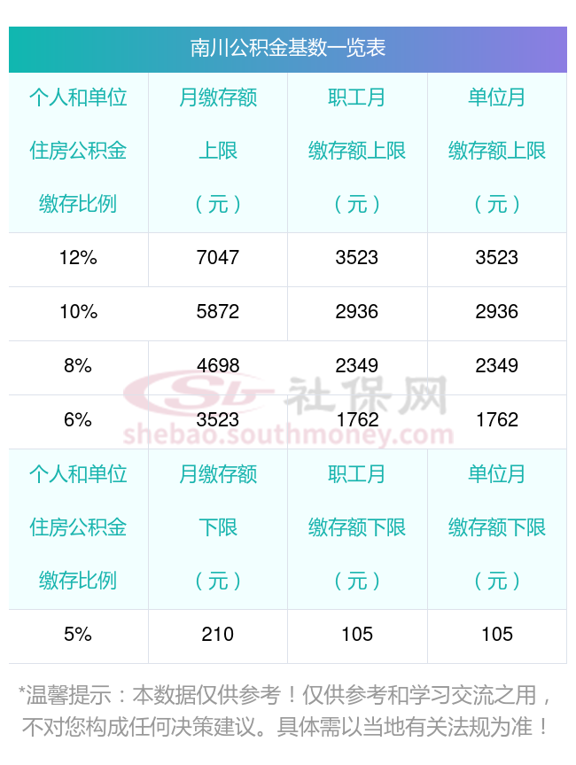 关于自己每月公积金缴纳多少?可以通过南川已经公布的公积金基数及缴存比例计算出相对于的费用: