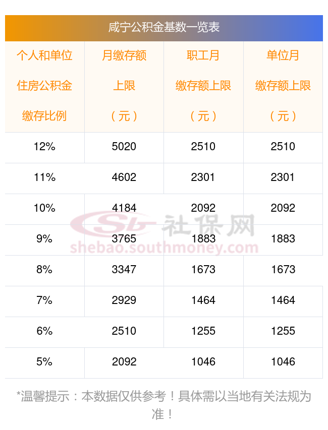 最新咸宁的住房公积金缴存基数范围是2420~35283,上限比例范围是5%-12%。