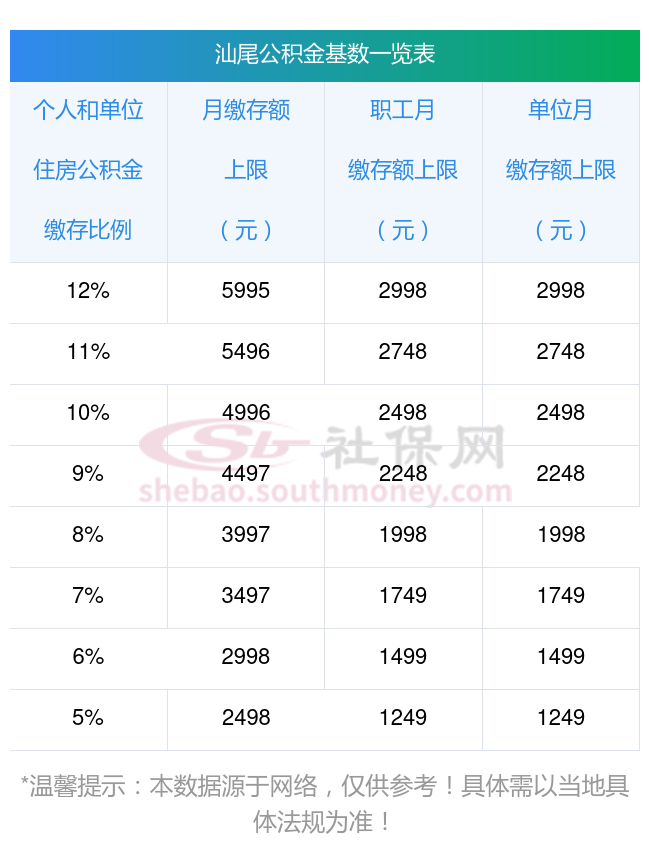 最新汕尾的住房公积金缴存基数范围是2420~35283,上限比例范围是5%-12%。