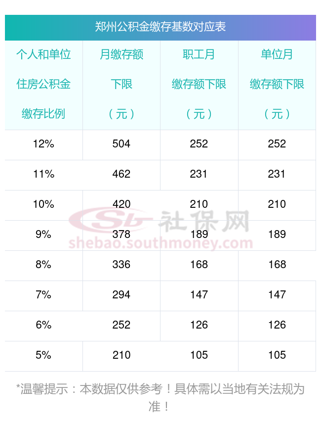 (3)最低月缴存额为郑州为210元(其中:单位105元,个人105元)。