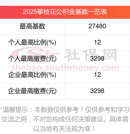 攀枝花住房公积金的基数上限、下限、比例如下: