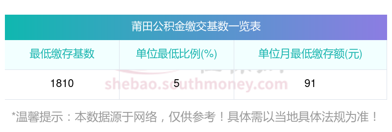 莆田住房公积金的基数下限标准如下: