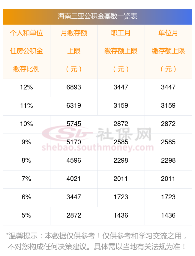 最新海南三亚的住房公积金缴存基数范围是2420~35283,上限比例范围是5%-12%。
